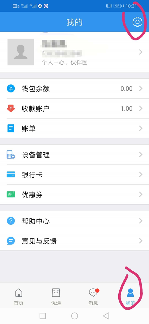 1:打開銀盛通APP,點我的,點右上角設置,如下圖所示